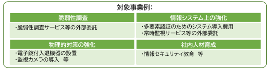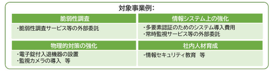 「サイバーセキュリティ強化」では、特定取組として次のような施策が支援対象となります。